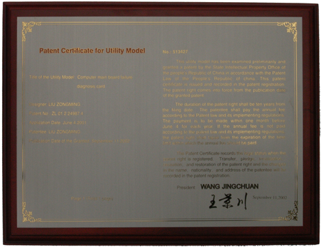 Chinese utility model patent No. 01224987.4 Certificate No.:513427