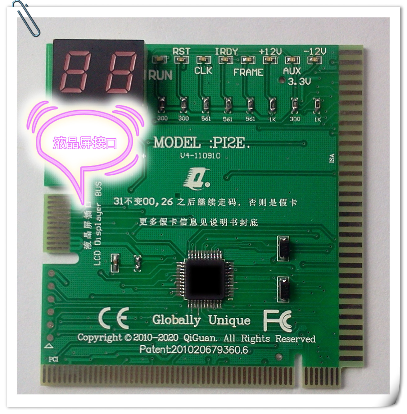 带有液晶屏显示插口的两位诊断卡,当用户觉得查阅说明书麻烦时,可再买奇冠生产的液晶屏文本外显示部件直接连接到该卡的“液晶屏插口”既可以从液晶屏上直接看代码含义、操作指南、等等, 省去翻说明书的麻烦。